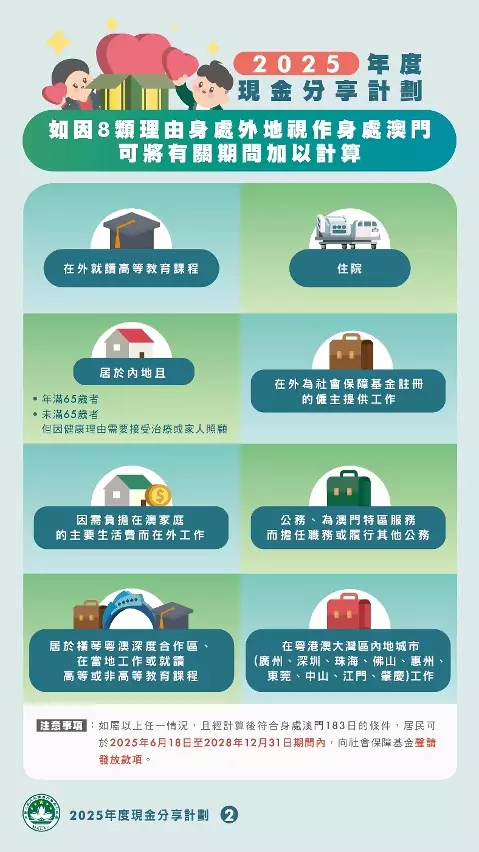 另一方面,行政法規參照第7/2017號法律「非強制性中央公積金制度」關於發放預算盈餘特別分配的規定,將因下列八種理由而不在澳門的情況視為身處澳門,並可申請將有關期間計入在澳期間,如經計算後符合在澳183日的標準,則可獲發款項: