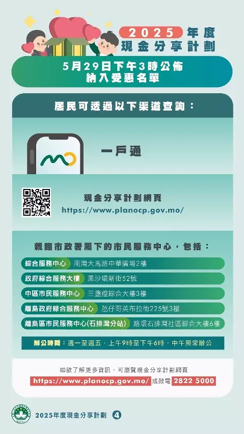 居民可於5月29日下午三時起登入「一戶通」或現金分享計劃網頁( https://www.planocp.gov.mo/ )查詢是否符合發放資格。符合發放資格的人士會按照既定的時間表,透過銀行轉帳或支票方式自動收取款項,無需提出申請。