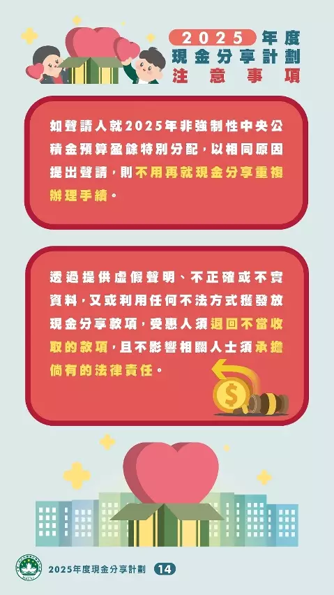 經聽取社會的意見,並參考第7/2017號法律「非強制性中央公積金制度」關於發放預算盈餘特別分配的規定,澳門特區政府制定「2025年度現金分享計劃」行政法規,對2025年度的現金分享的發放資格及聲請手續作出規範。