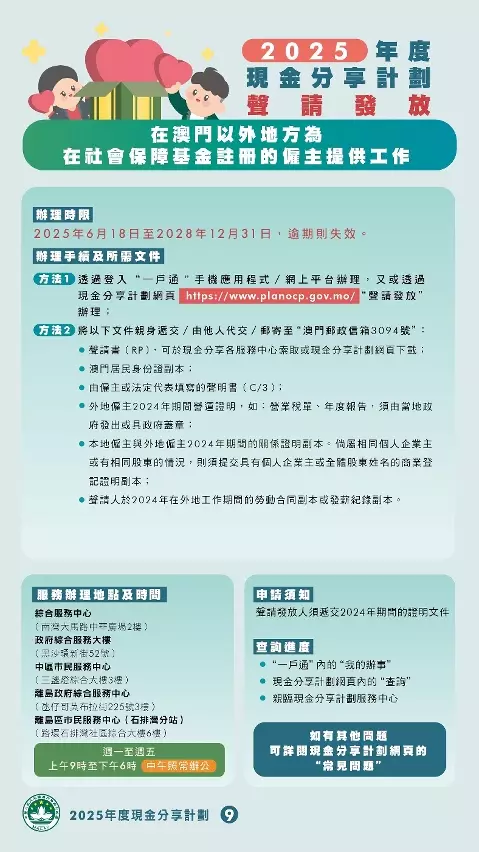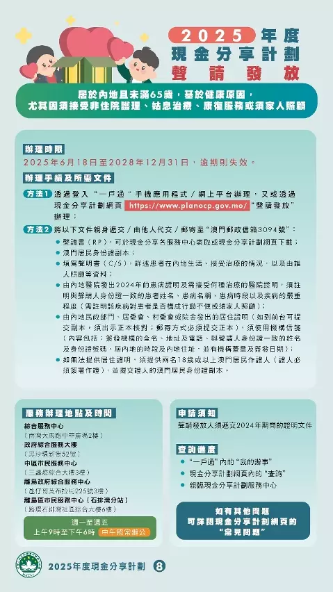 對於初步未符合資格的人士,如在2024年因法定理由身處澳門以外地方,且經計算後符合在澳183日的要求,亦可在2025年6月18日至2028年12月31日連同相關證明文件,透過「一戶通」、現金分享計劃網頁、親身、代交或郵寄(澳門郵政信箱3094號)方式向社會保障基金提出聲請,在審核後如確認符合條件則會獲發放款項。