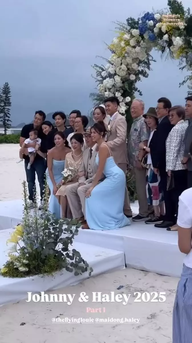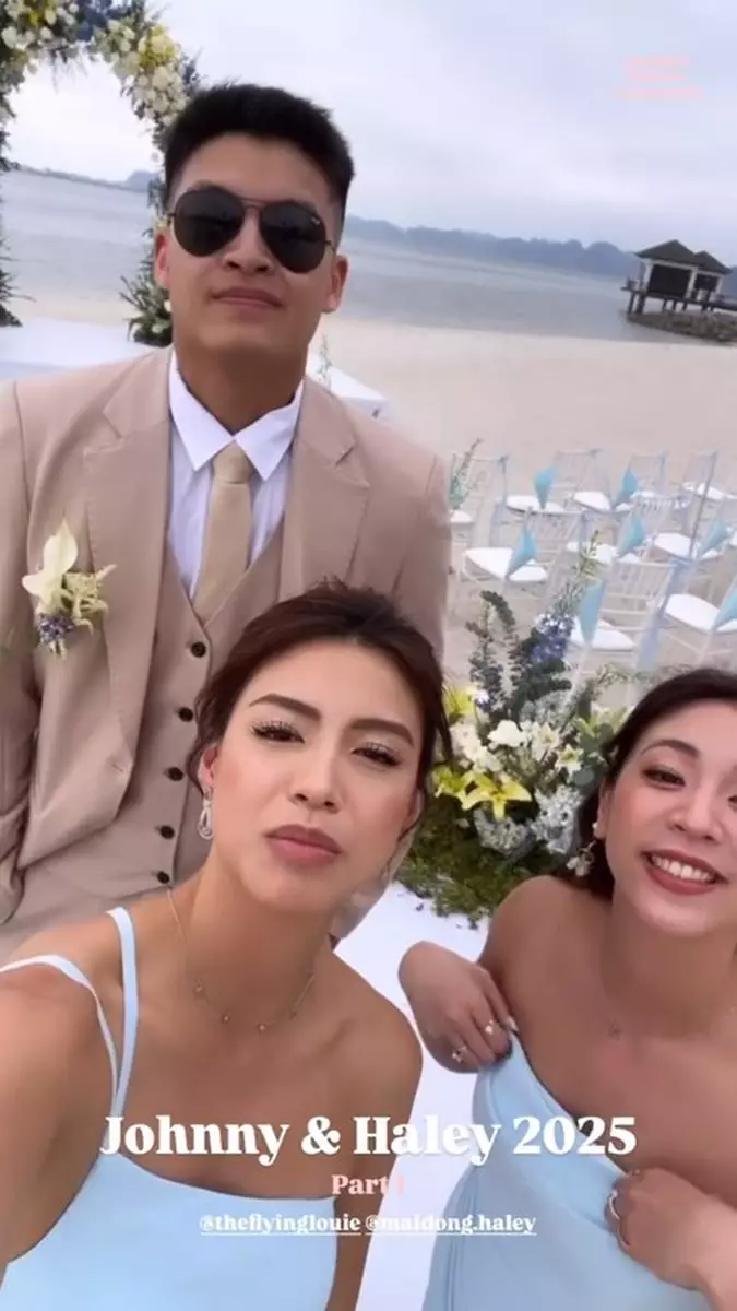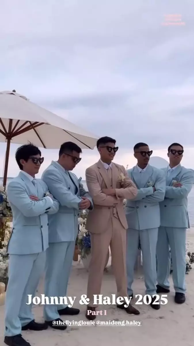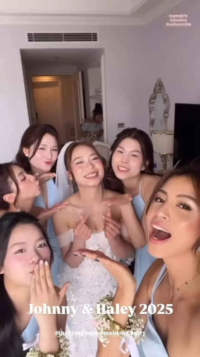影片中可見,Juliette與妹妹Tiffany Louie一同擔任新娘姐姊團,齊齊穿上粉藍色的伴娘裙,大晒美好身段!婚禮在沙灘舉行,相當浪漫,新娘子Haley身穿簡約的off-shoulder婚紗,性感又不失優雅,而新郎Johnny則穿著卡其色西裝,與兄弟團齊齊戴上黑超影相,非常有型!