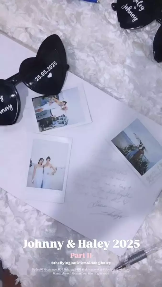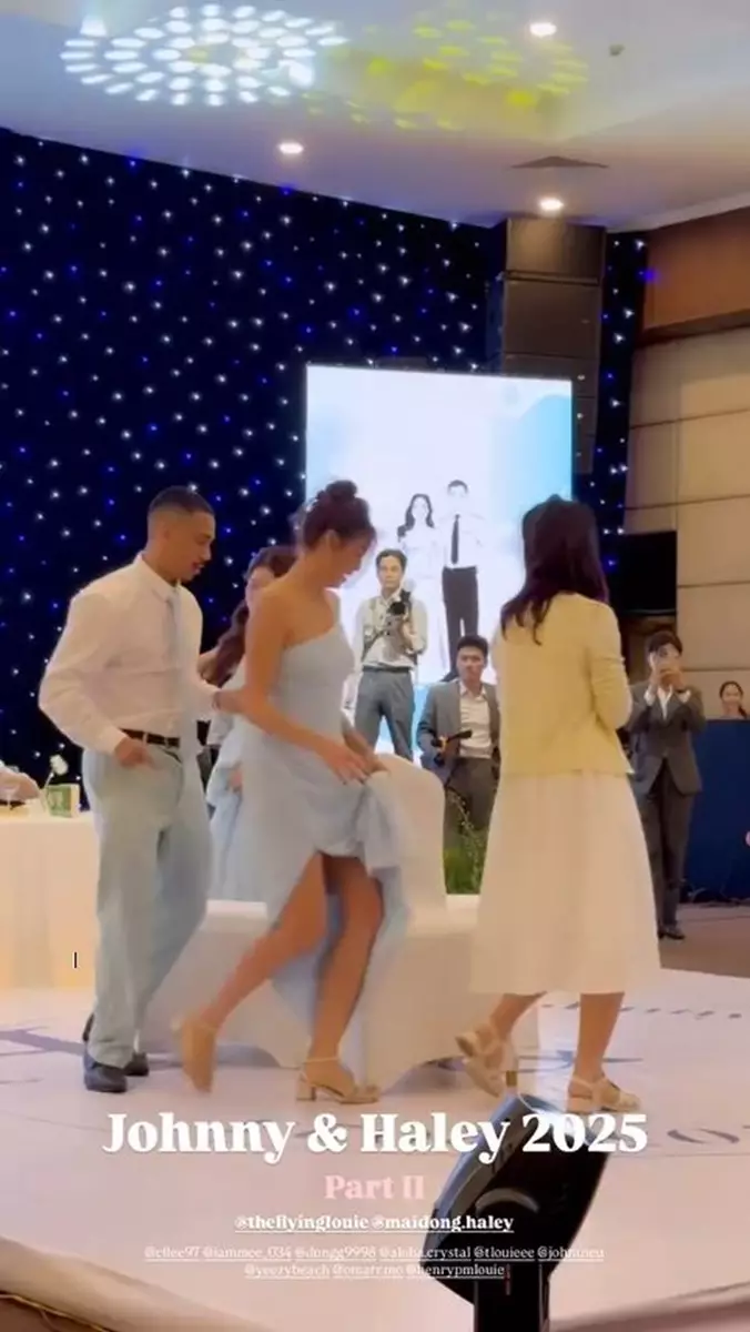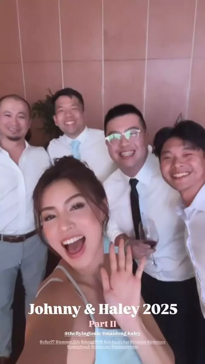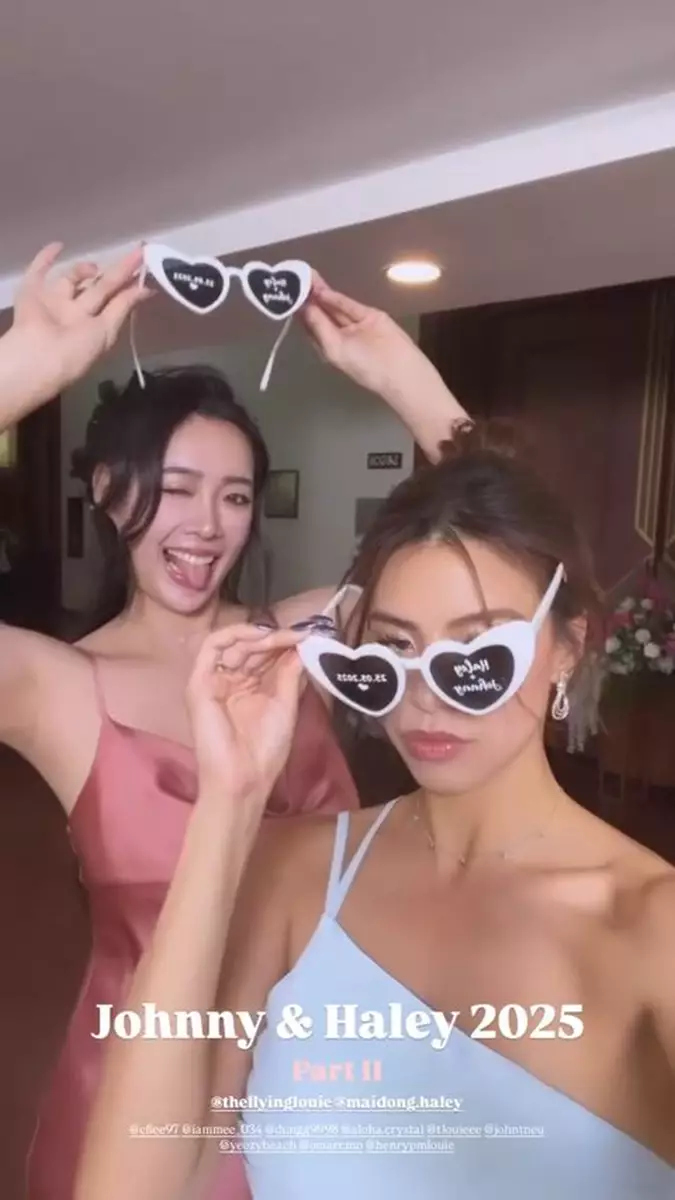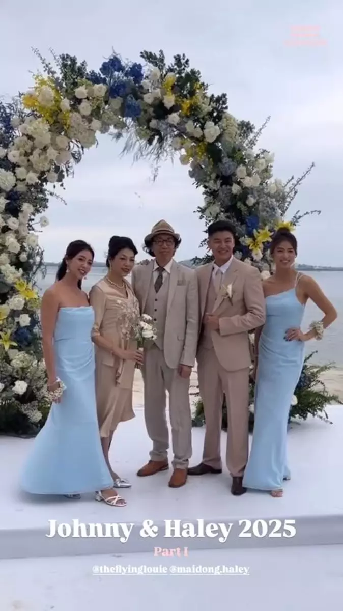 影片中可見,Juliette與妹妹Tiffany Louie一同擔任新娘姐姊團,齊齊穿上粉藍色的伴娘裙,大晒美好身段!婚禮在沙灘舉行,相當浪漫,新娘子Haley身穿簡約的off-shoulder婚紗,性感又不失優雅,而新郎Johnny則穿著卡其色西裝,與兄弟團齊齊戴上黑超影相,非常有型!