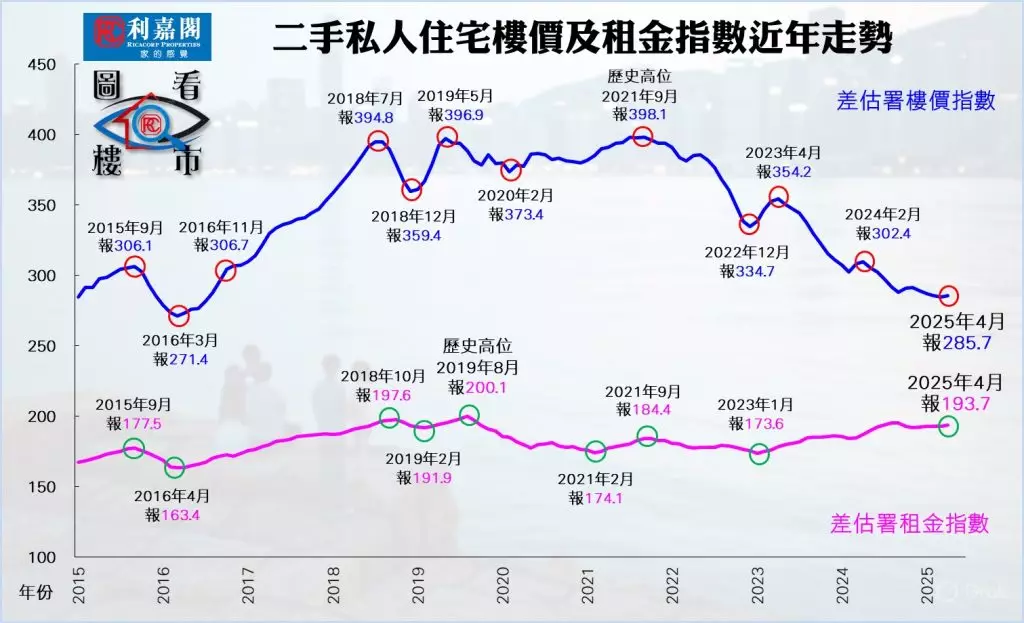 據差估署最新數字,2025年4月份的私人住宅售價指數達到285.7點,較3月的284.7點上升,回升至近三個月的高位。不過,這一回暖的表現仍然無法掩蓋今年前四個月樓價累計下跌1.21%的事實,與2021年9月的歷史高位398.1點相比,樓價至今更已累跌28.23%。