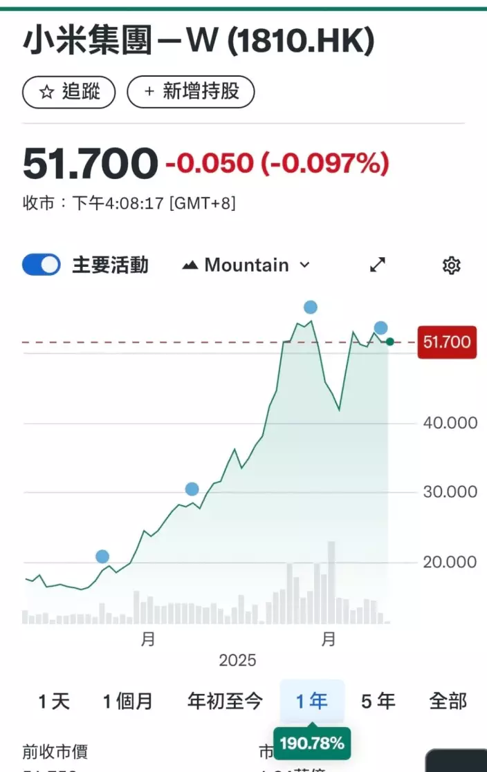 總的而言,小米利好因素不少,估計稍作整固後,股價可再向上。唯一美中不足的是小米過去一年,由17元起步,升到如今51元,累升190%,升幅頗大,市值高達1.3萬億元,風險自然增加。小米可作炒作目標,買可以跟佢走一段,有一定利潤就可食糊。