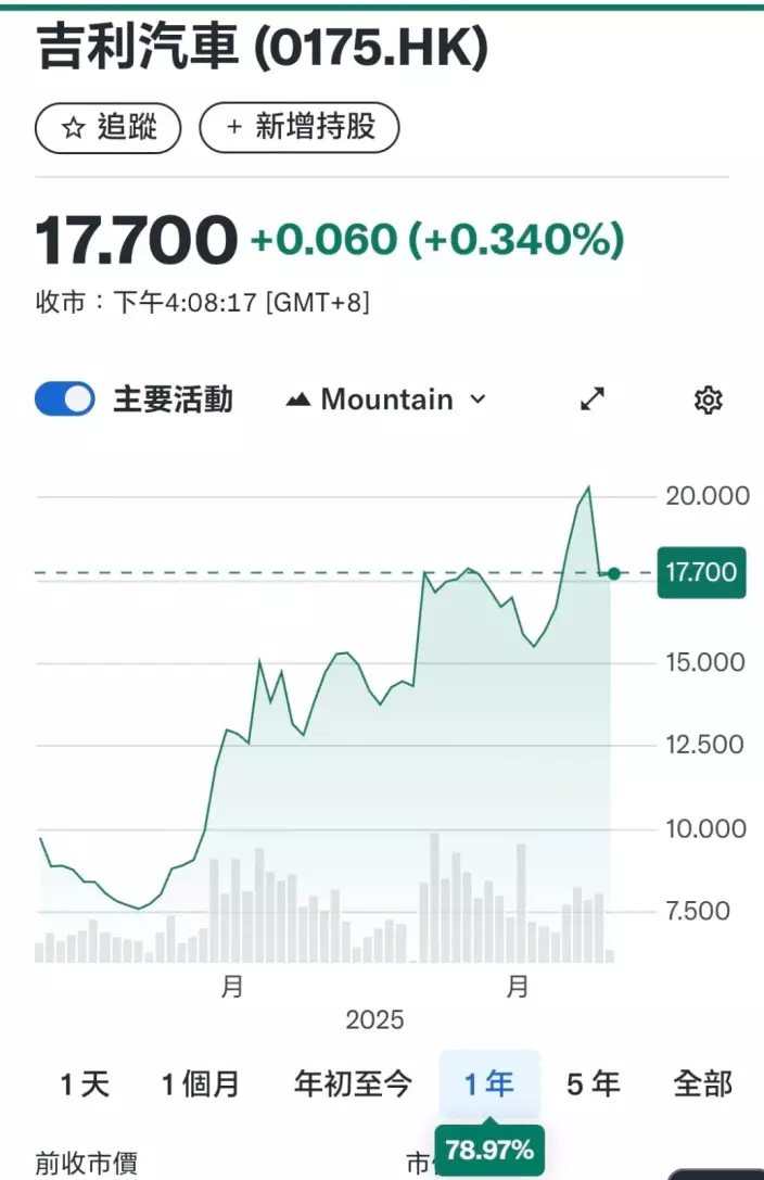 三隻之中,吉利最無炒味,升得最少,一年前由近10元起步,現價17.7元,升了79%,升幅最少,而且市值細只有1785億,有成長空間,但也可能長期落後。
