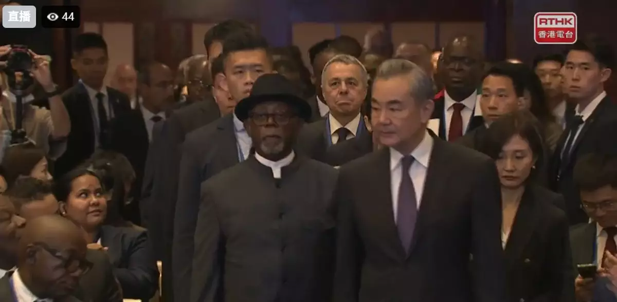 王毅在行政長官李家超的陪同下,進入在灣仔君悅酒店的儀式會場。港台直播影片截圖