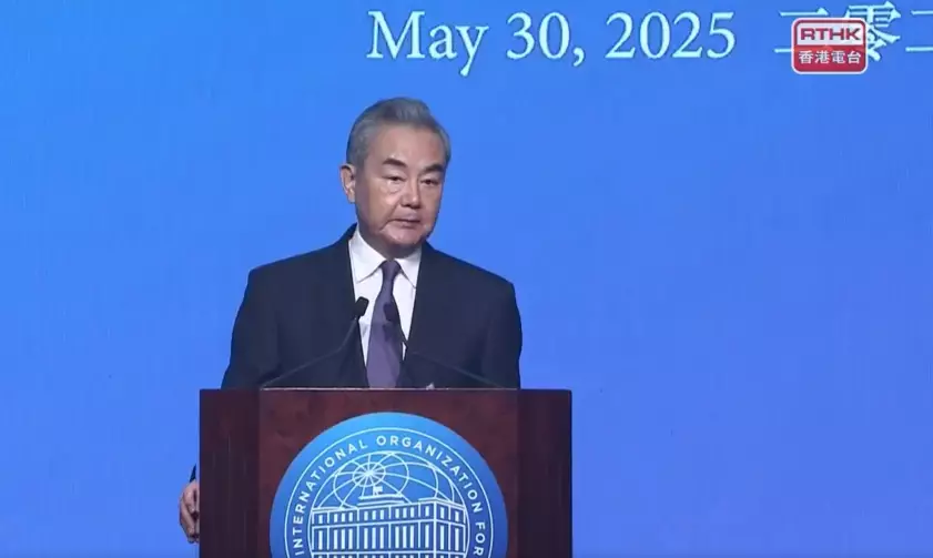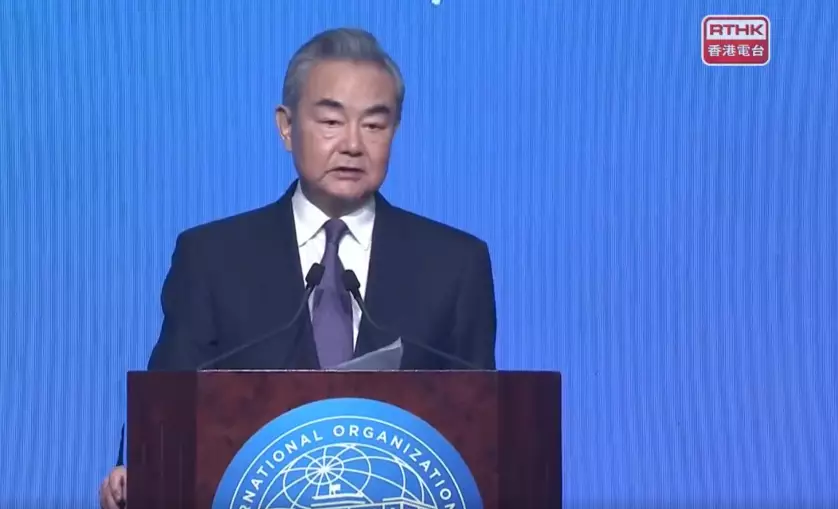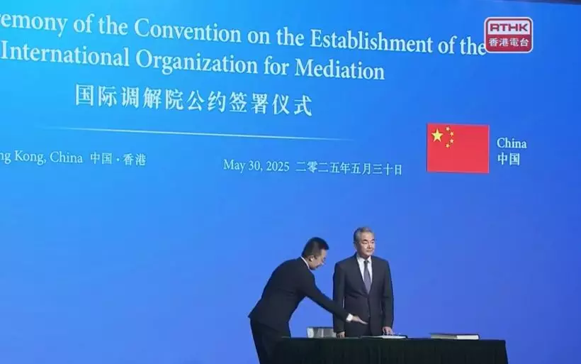 王毅之後上台簽署《關於建立國際調解院的公約》。港台直播影片截圖