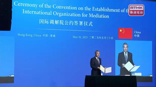 中共中央政治局委員、外交部長王毅在本港出席國際調解院公約簽署儀式。王毅表示,經過公約談判國的協商決定,香港將會成為國際調解院總部的所在地。