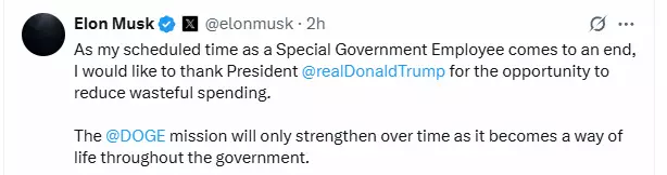 新華社報道,馬斯克在帖文中說:「在我作為特殊政府僱員的任期即將結束之際,我要感謝特朗普總統給我這個機會。」他還說,隨著時間推移,政府效率部的使命將會「越來越強」。
