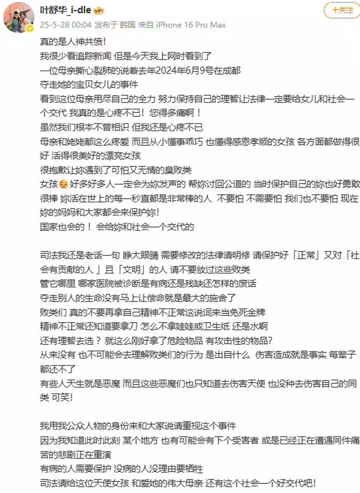 「孩子為陪我放棄事業,卻這樣無辜送命!」王女士拒絕接受兇手精神鑑定結果,已申請重新鑑定,堅持要求判處死刑。她更指控社區保安失職,擬在刑事案結後追究民事責任。案件引發輿論關注,韓國女團(G)I-DLE成員葉舒華亦在社交平台聲援,贊同「精神病不應成免死金牌」的主張。