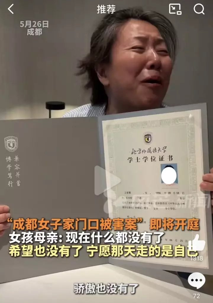 王女士透露,女兒自幼成績優異,從成都外國語學校保送北京外國語大學,更曾赴日本神戶大學交換。原在北京日企工作的王某雅,為陪伴寡母毅然返鄉轉行自媒體,卻在人生起步階段遇害。