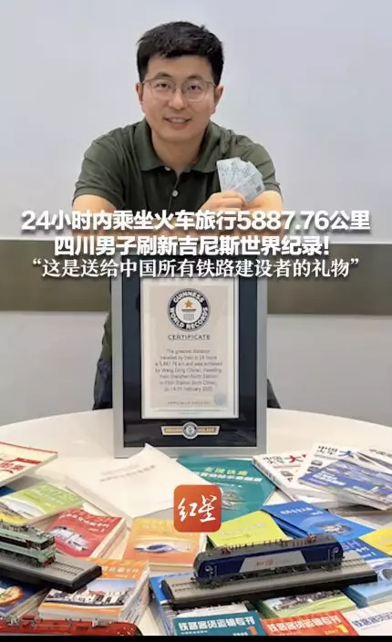 四川一名男子24小時搭火車橫跨逾5800公里,成功創下「24小時火車旅行最遠距離」的世界紀錄。
