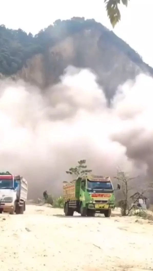 印尼西爪哇省一個採石場發生山泥傾瀉,泥石席捲而來。X影片截圖
