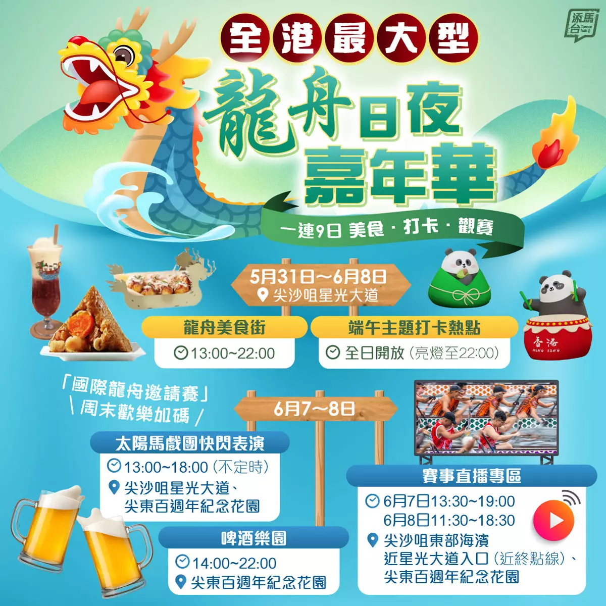 旅發局主辦的香港國際龍舟邀請賽25年以嘉年華形式,舉辦「龍舟日夜嘉年華」,5月31日起一連9日在尖沙咀舉行。
