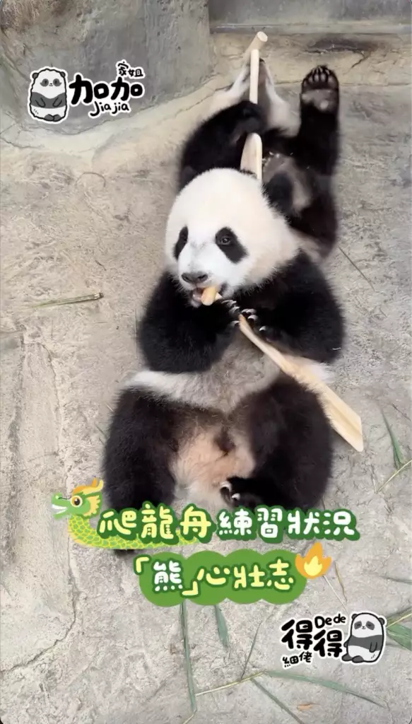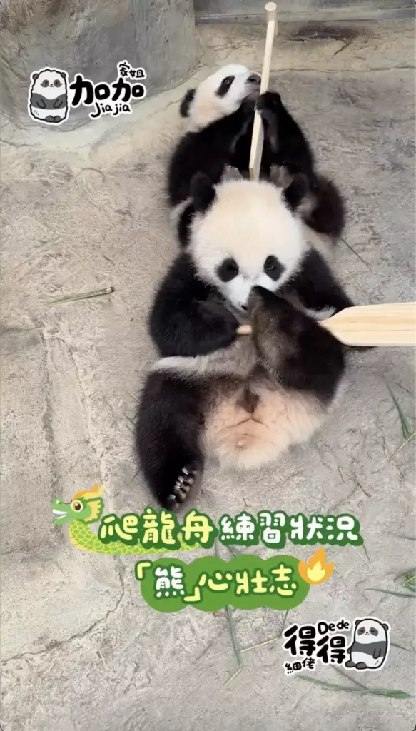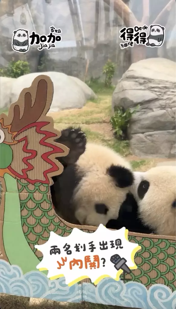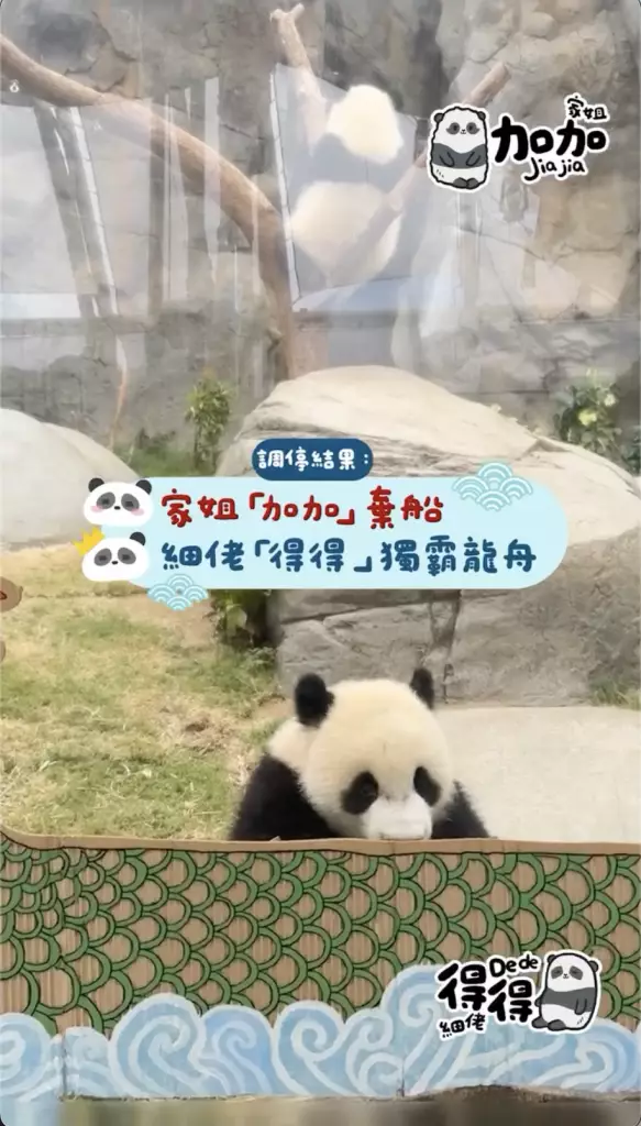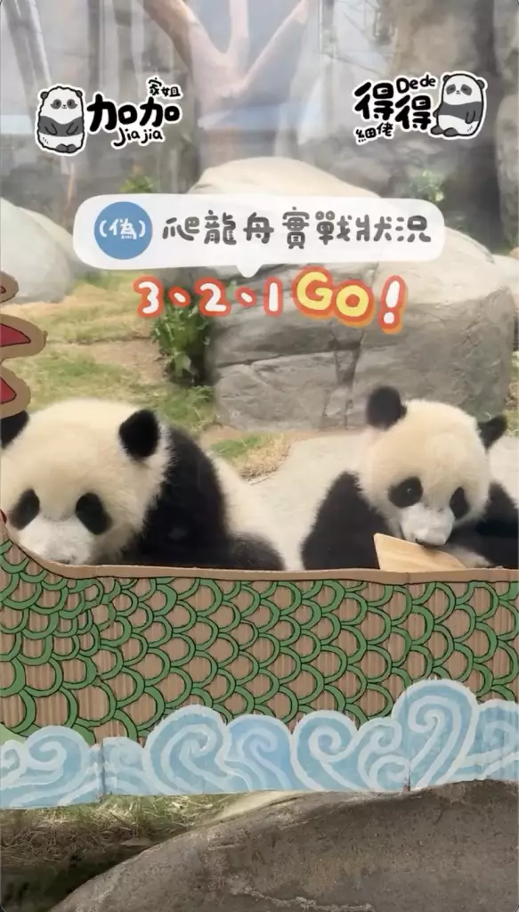 海洋公園在社交平台公開家姐「加加」同細佬「得得」首次出戰「爬」龍舟賽的精彩片段,姐弟兩「熊」心壯志,經過一陣緊密鑼鼓的練習便直接實戰上場參賽,只見家姐同細佬一人咬住一支小童版划槳就上場,不過很快兩名小健兒就陷入「內訌」直接在龍舟上上演熊貓界MMA,要召喚奶爸出面調停,最終戰果因為家姐無心戀戰,直接棄船而去,細佬就成功獨霸龍舟,更得戚的祝福大家「端午節快樂」。