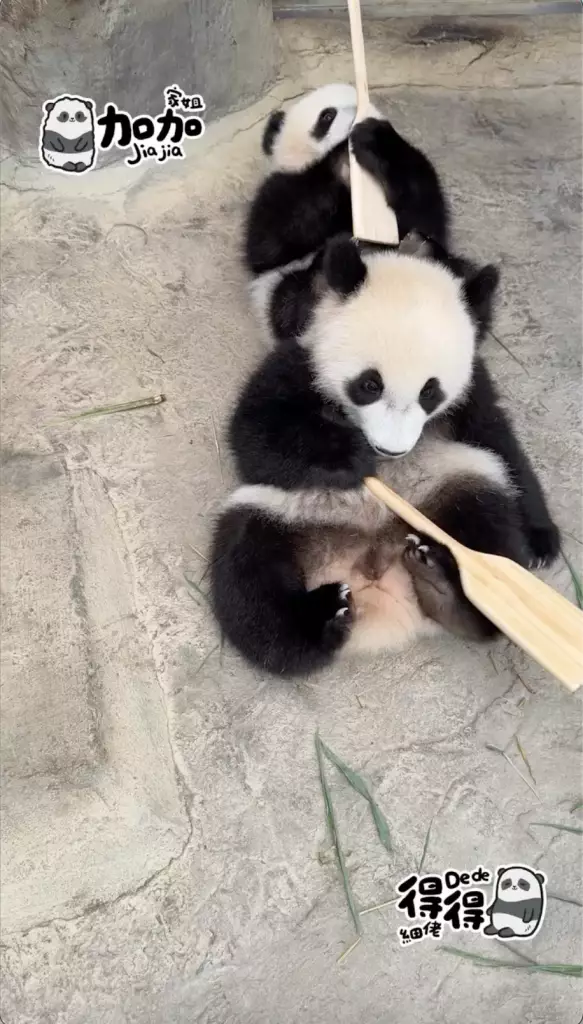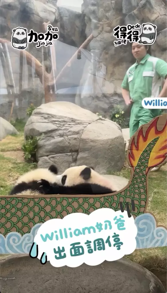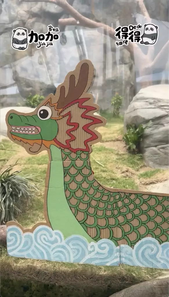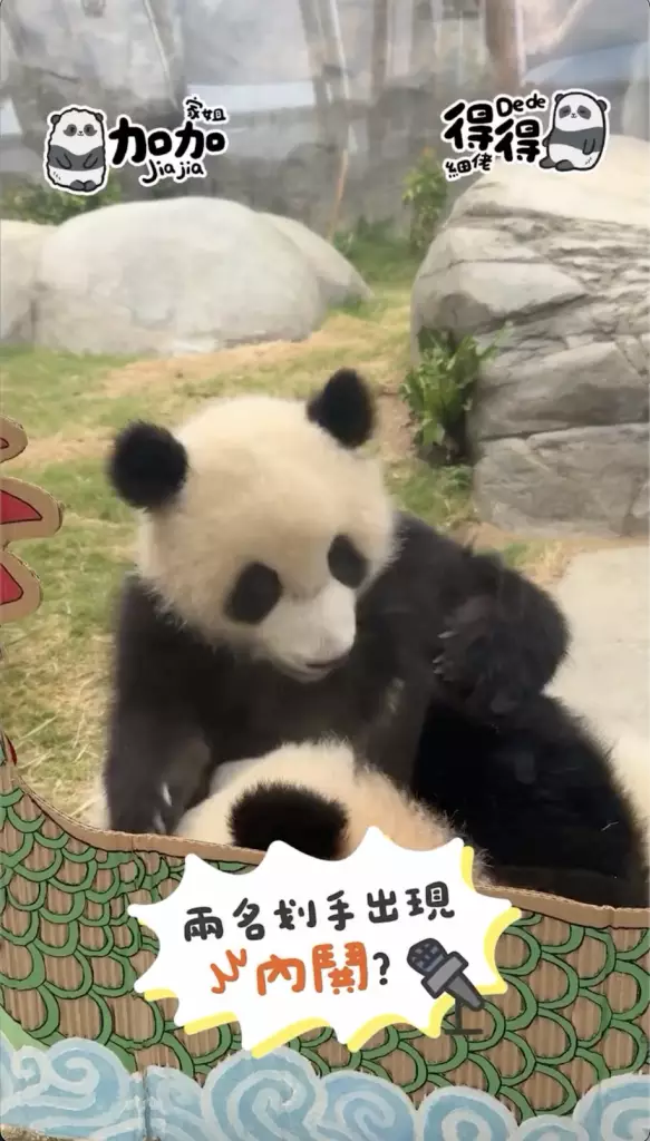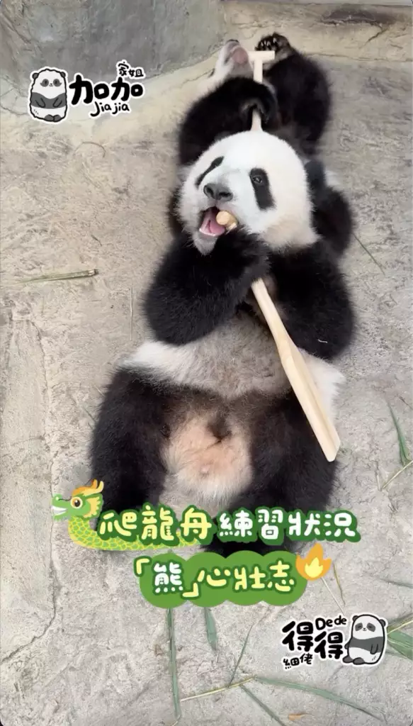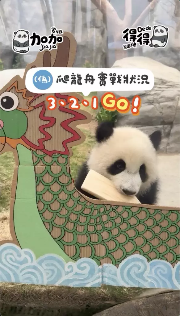 海洋公園在社交平台公開家姐「加加」同細佬「得得」首次出戰「爬」龍舟賽的精彩片段,姐弟兩「熊」心壯志,經過一陣緊密鑼鼓的練習便直接實戰上場參賽,只見家姐同細佬一人咬住一支小童版划槳就上場,不過很快兩名小健兒就陷入「內訌」直接在龍舟上上演熊貓界MMA,要召喚奶爸出面調停,最終戰果因為家姐無心戀戰,直接棄船而去,細佬就成功獨霸龍舟,更得戚的祝福大家「端午節快樂」。