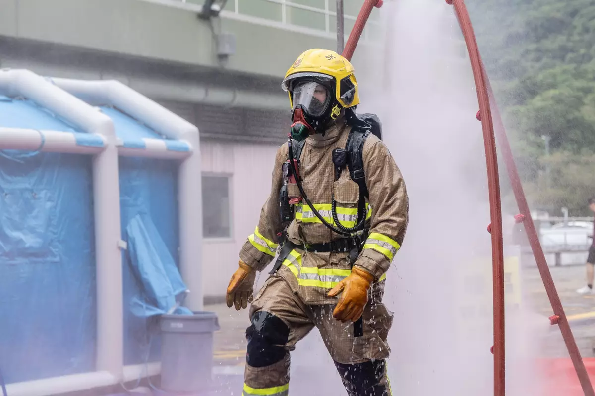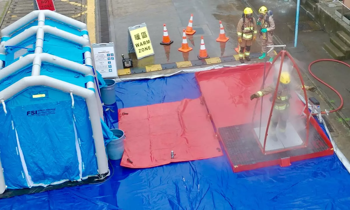 消防處聯同多個部門於西貢北港濾水廠進行跨部門「化生輻核」即化學、生物、輻射或核事故演習,模擬濾水廠開放日期間發生氯氣洩漏。