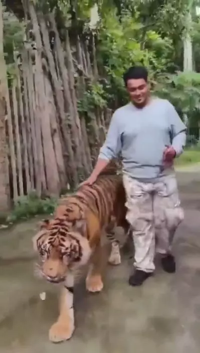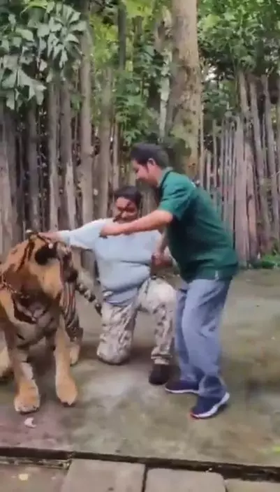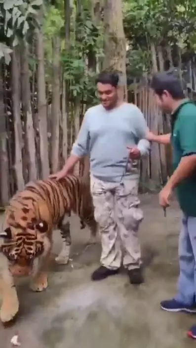 整個恐怖過程被拍成片上傳至社交平台,不到30秒的片段中,遊客以鐵鏈拖著老虎,然後蹲下準備自拍。期間,旁邊的一名馴獸師拿棍子輕拍老虎,試圖讓牠配合拍照。