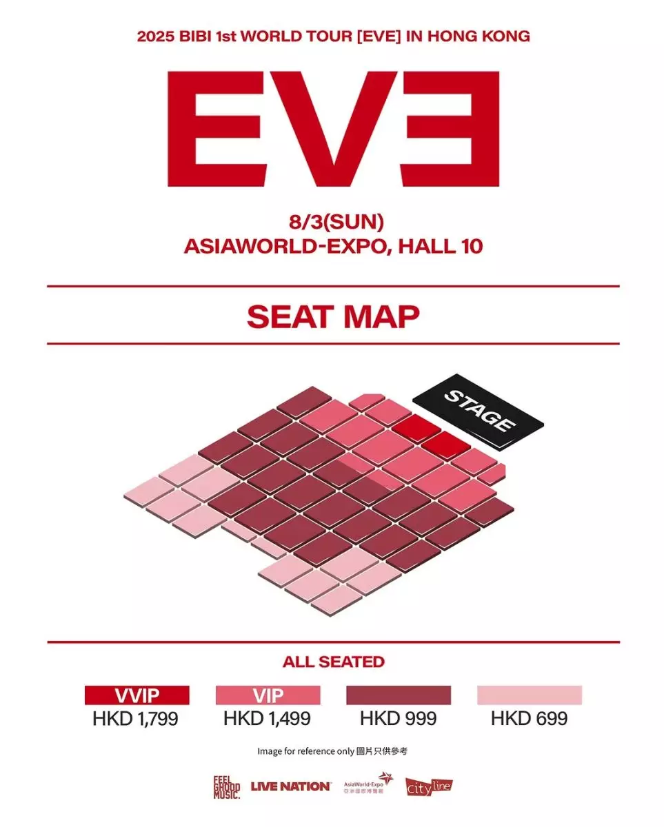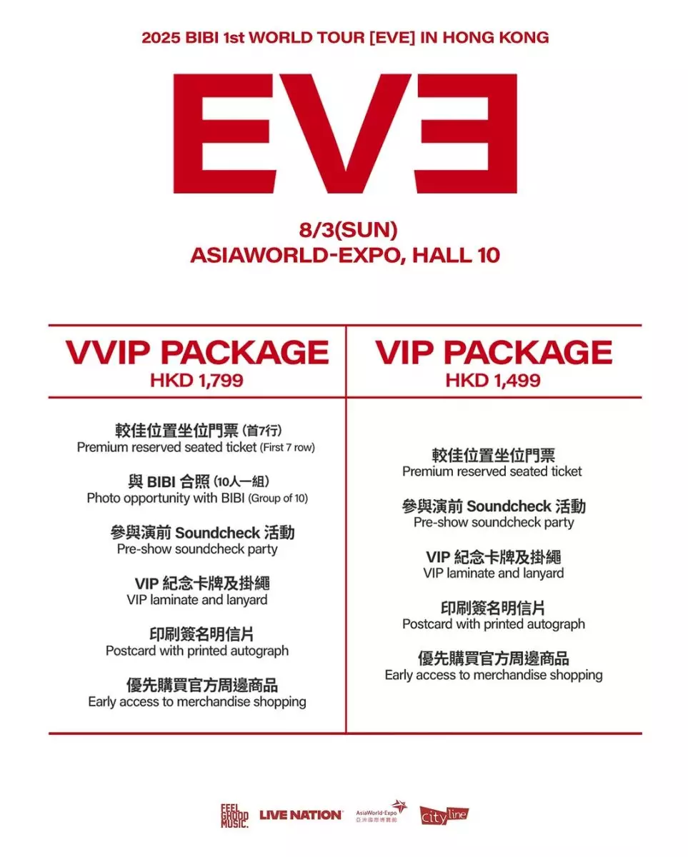 韓國唱作歌⼿BIBI宣佈展開⾸個世界巡演,屆時將會演唱她的⼤熱歌曲和最新曲⽬,⾹港站僅此⼀場。《2025 BIBI 1st WORLD TOUR [EVE] IN HONG KONG 》將於 2025年8⽉3⽇(星期⽇)假亞洲國際博覽館舉⾏10號展館舉⾏。