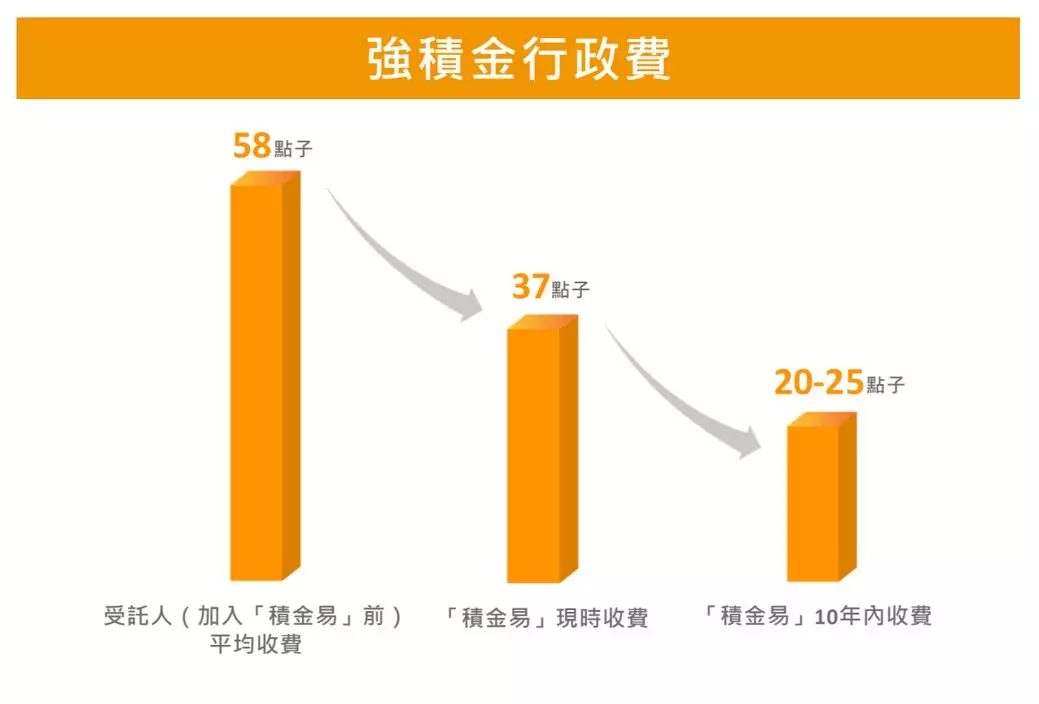 劉麥嘉軒在網誌提到,強積金基金下調行政費亦自首階段上台開始落實。「積金易」收費目前為0.37%,比受託人加入平台前收取平均0.58%行政費低36%。這個水平將逐步再下調,預計在10年內減至大約0.20%至0.25%,總計可以節省300億至400億元,相等於受託人現時收取的行政費降低41%至55%。