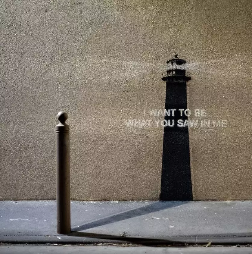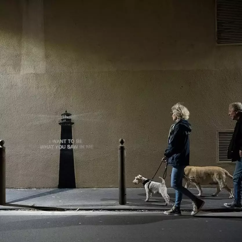 Le street art représente l’ombre d’un poteau transformée en phare, accompagnée de cette phrase : "Je veux être ce que tu as vu en moi."