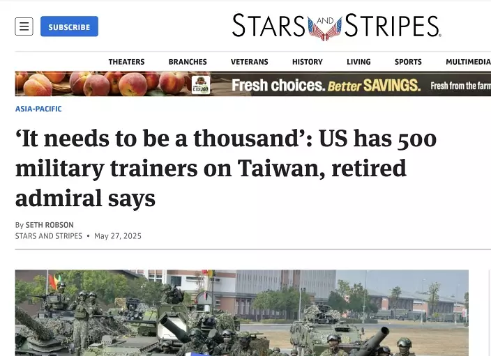 《星條旗報》報道,已退役美國海軍少將蒙哥馬利在美國國會聲稱,約有500名美軍在中國台灣地區活動,是美國國會披露的10倍以上。