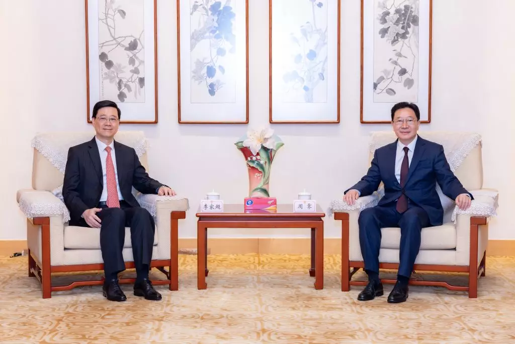 新任中聯辦主任周霽早上在中聯辦會見行政長官李家超。中聯辦圖片