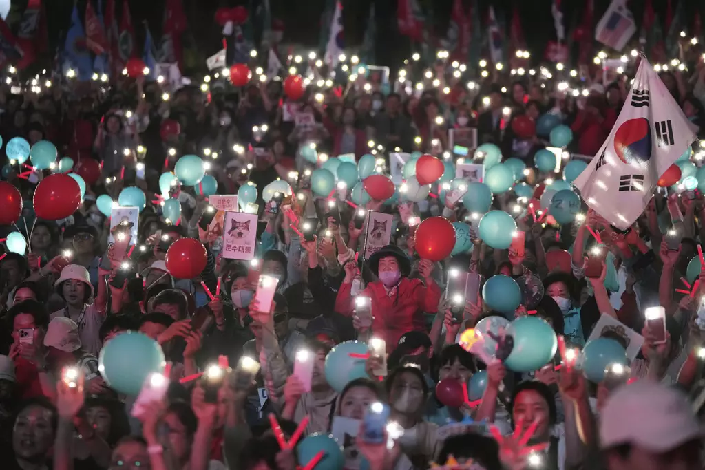 南韓總統選舉星期二舉行,各候選人爭取最後拉票,圖為李在明的支持者。AP圖片