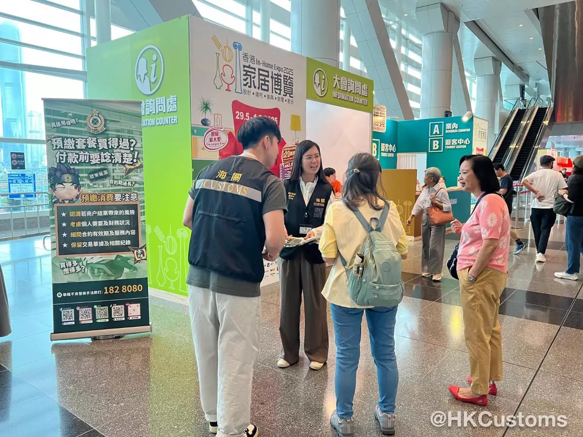 香港海關於5月29日至6月1日在灣仔會展向參與「香港家居博覽2025」的市民派發宣傳單張,提醒消費者喺購買預繳套餐時一定要小心。