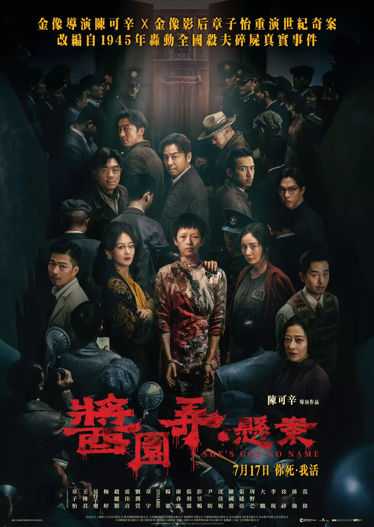 陳可辛導演繼《甜蜜蜜》、《投名狀》、《中國合伙人》、《親愛的》及《奪冠》後,推出全新大時代小人物重榜力作《醬園弄》第一部《醬園弄.懸案》(She’s Got No Name),是改編自發生在1945年的上海女子詹周氏殺夫奇案,首度與金像影后章子怡合作,配搭超華麗巨星陣容包括王傳君、易烊千璽、梅婷、趙麗穎、雷佳音、劉潤萱、章宇、Anna Kirke、楊冪、康春雷、張羽霖、彭昱暢、尹昉、沈佳妮、陳國慶、張建亞、周野芒、大鵬、李現、徐祥、孫強、范偉主演(按角色出場順序排列),23位實力演員皆以極具顛覆性的形象帶來驚異演出。香港將於7月17日公映,7月12、13日設優先場讓影迷先睹為快。昨日(7月11日)釋出最新電影預告、人物劇照及製作特輯,揭開更多幕後的精彩故事,看《醬園弄.懸案》如何找到獨特的表達方式和美學。
