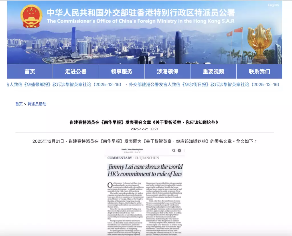 12月21日,外交部駐港公署特派員崔建春在《南華早報》發表題為《關於黎智英案,你應該知道這些》的署名文章。針對西方輿論的某些負面解讀,由黎智英為何被定罪、黎智英是否受到不公正對待,以及干預黎案的西方國家做錯了什麼三方面,全面闡明關於黎案事實,希望以此維護法治精神,讓全世界見證法治保障下的香港充滿生機活力與繁榮穩定。