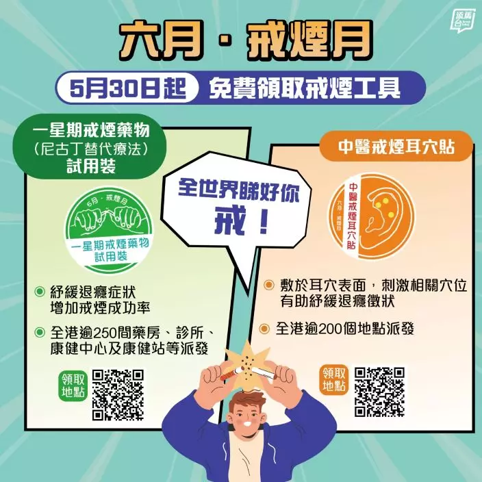 踏入六月,戒煙月正式開始。衞生署推出系列活動鼓勵吸煙人士嘗試戒煙,以降低患上吸煙相關疾病和死亡的風險,其中包括下載「戒煙達人」應用程式即可免費領取尼古丁替代療法試用裝或中醫戒煙耳穴貼。