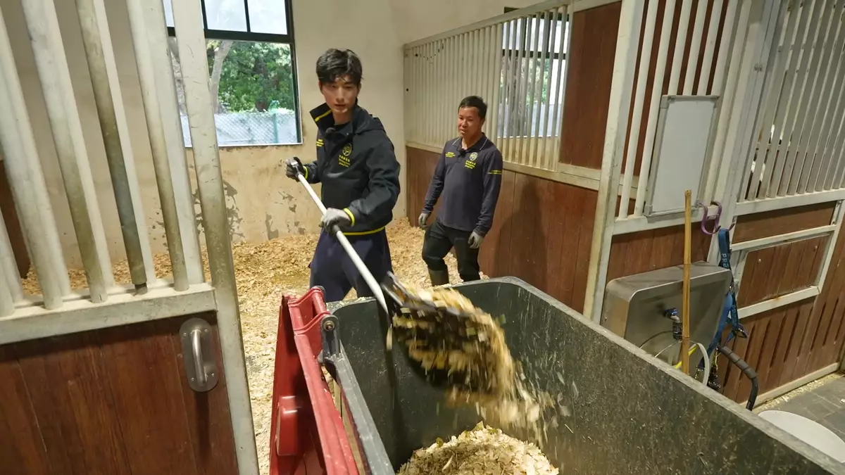 清理馬糞時,Aska幽默地說:「發現啲屎唔係好臭,佢哋平時飲食應該幾健康!。」