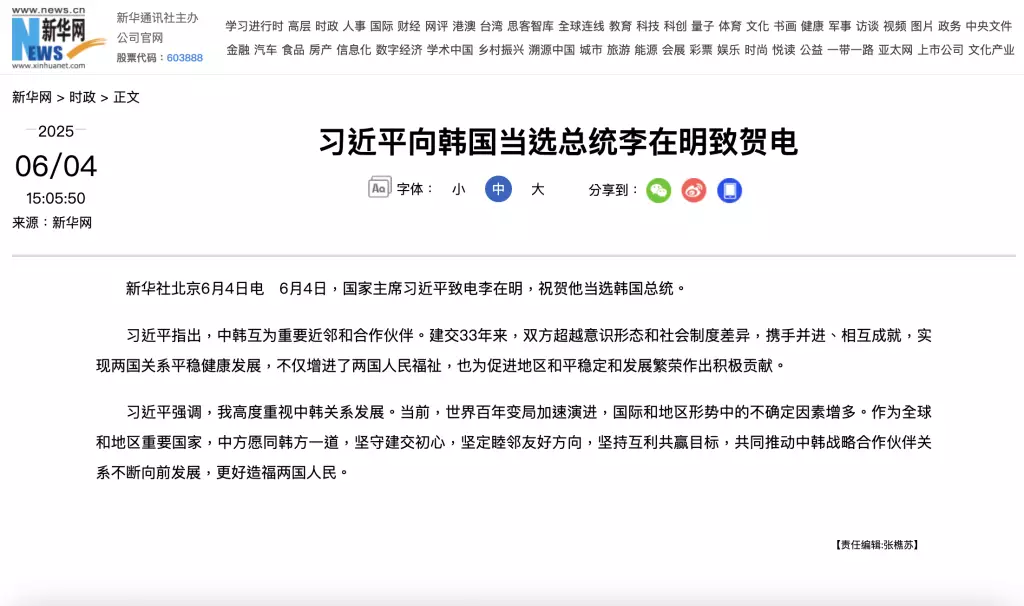 國家主席習近平致電李在明,祝賀他當選南韓總統。