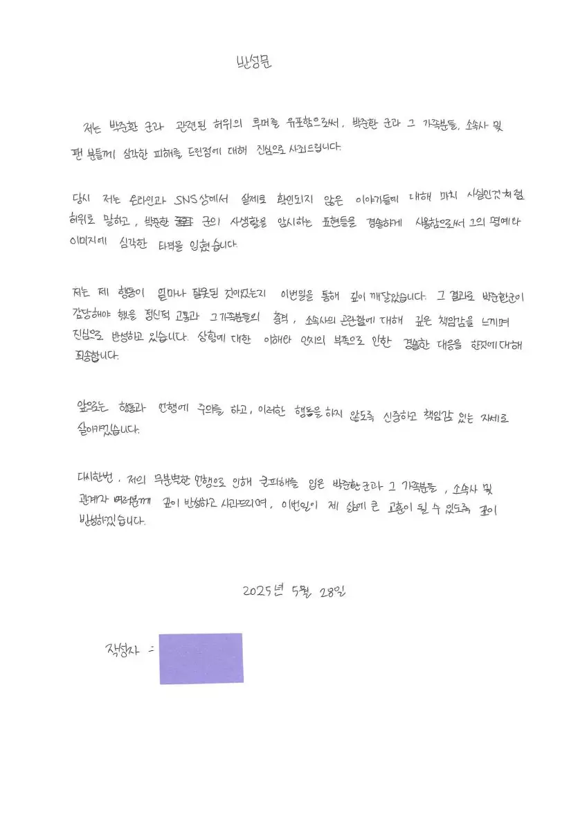 STARSHIP公開一名造謠者的手寫反省書。STARSHIP娛樂圖片