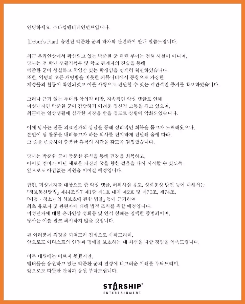 儘管公司已澄清謠言不實,但持續的惡意評論及網路攻擊對未成年的朴俊奐造成嚴重心理壓力,影響其日常生活。STARSHIP娛樂表示,朴俊奐因此表達退出組合的強烈意願,經與專業醫療團隊諮詢後,公司決定尊重其選擇,安排充分休息時間並提供心理輔導,協助他恢復健康。聲明中強調,STARSHIP將繼續支持朴俊奐未來朝新目標邁進。