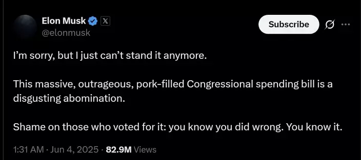 馬斯克在X的帖文,被視為是他與曾經親密的戰友特朗普「決裂」的進一步浮面。帖文說「對不起,我再也受不了」,馬斯克直斥預算案離譜、充滿利益輸送、令人噁心、可憎,直指議員明知是錯仍投票贊成是可恥。