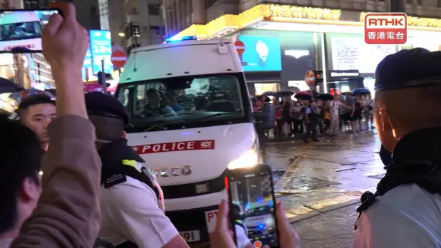 警方晚上在銅鑼灣及維園一帶加強巡邏,多輛警車在場。現場所見,有途人被截查身份證,亦有人被帶上警車。
