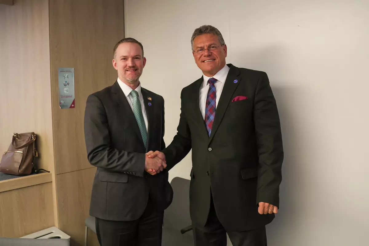 謝夫喬維奇(右)和格里爾(左)握手。Maroš Šefčovič X圖片