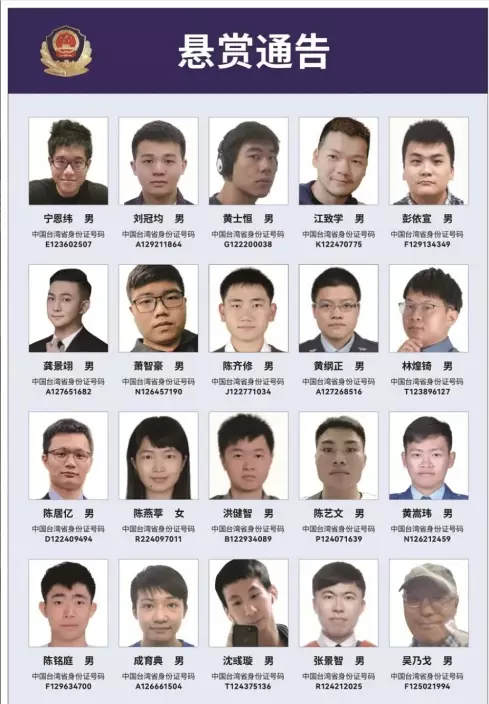 廣州市公安局天河區分局6月5日正式發布《懸賞通告》,對寧恩緯、劉冠均、黃士恆、宣學、彭依等20名參與實施網路攻擊活動的嫌疑人進行懸賞通緝,每名犯罪嫌疑人1萬元人民幣的金額予以獎勵。