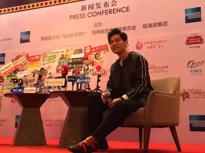 周杰倫以大使身份裝出席觀瀾湖世界明星賽發佈會。