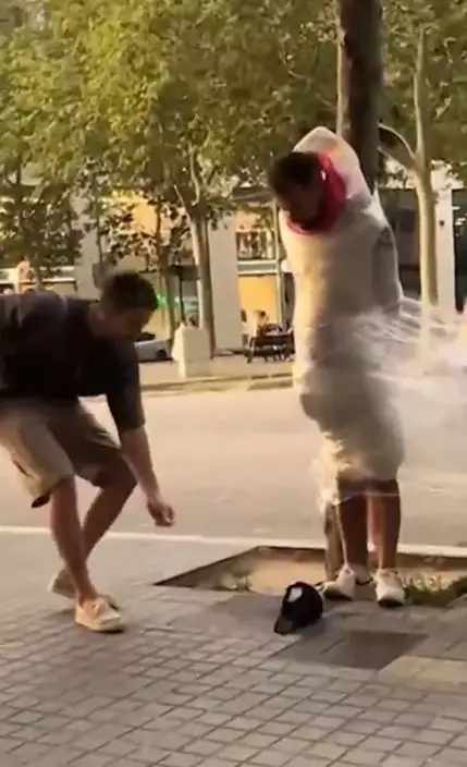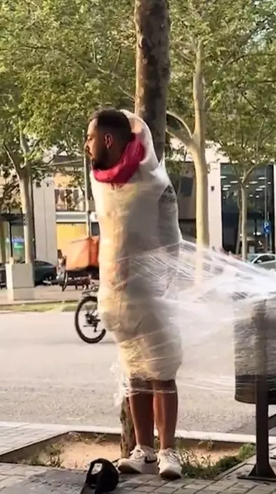 Sus amigos le enrollan con papel film en un árbol y hasta que no reúna 50 euros no lo sueltan.