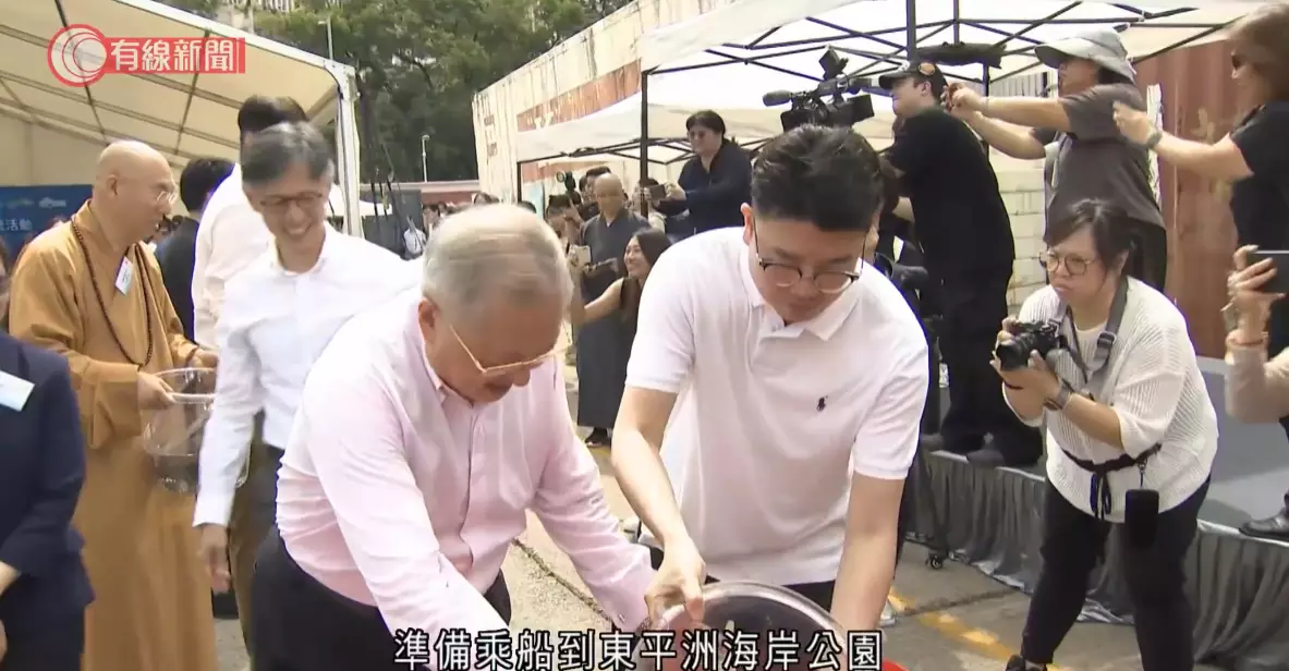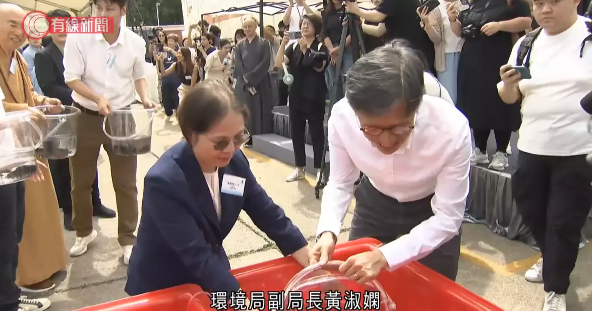 漁護署星期五(6月6日)聯同佛教團體,在大埔魚類批發市場舉行增殖放流活動,共投放約2.3萬條幼魚。有線新聞影片截圖