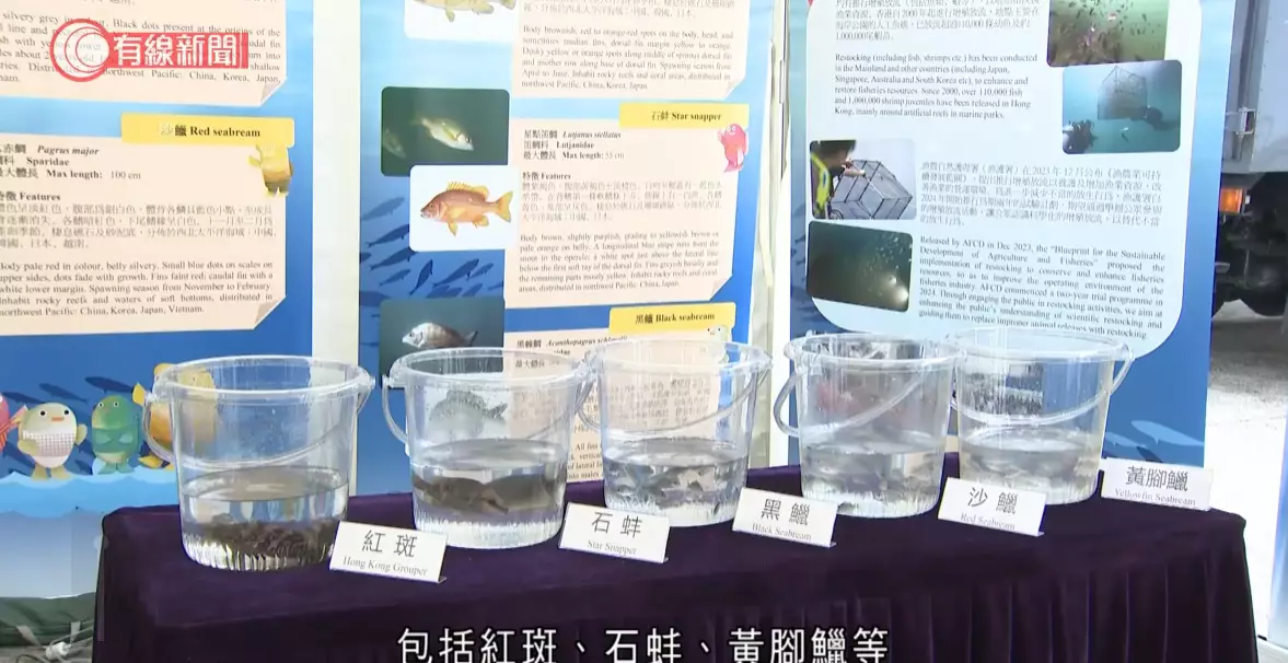 放流品種包括紅斑、石蚌、沙鱲、黃腳鱲及黑鱲,地點選址東平洲海岸公園及附近水域。有線新聞影片截圖