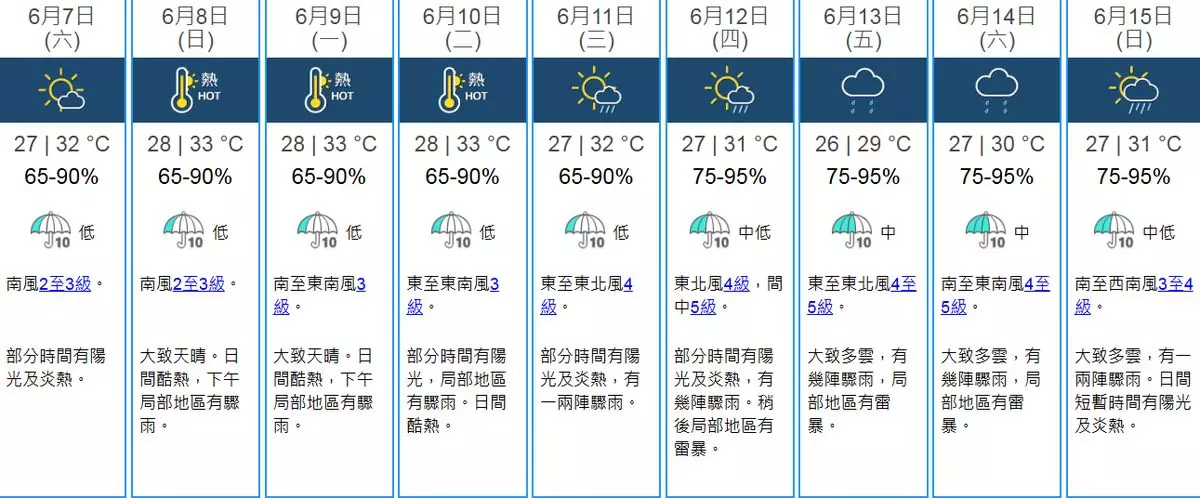 天文台表示,高空反氣旋會在未來數日為華南帶來大致良好的天氣,該區日間酷熱。而一道廣闊低壓槽會在週末期間為南海中部及菲律賓以東海域帶來不穩定天氣。
