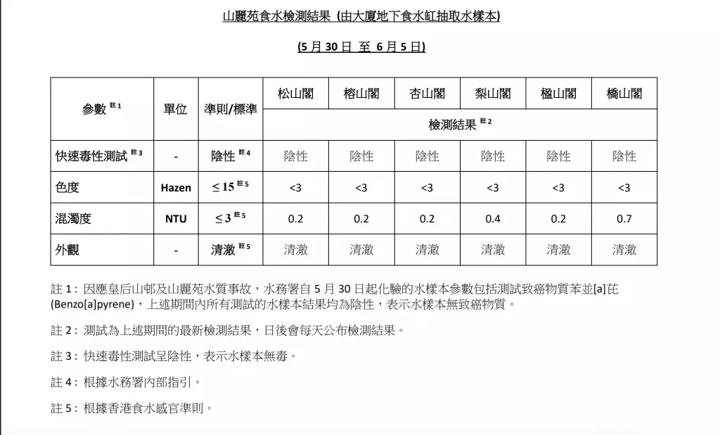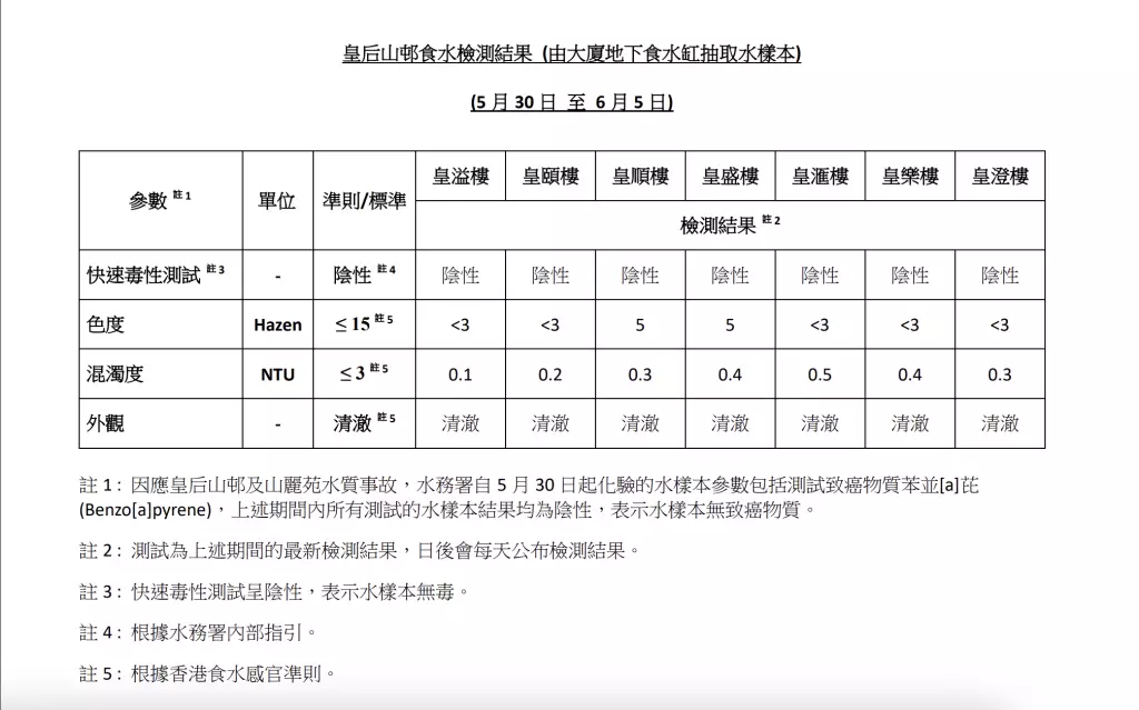 水務署網頁公布5月30日至6月5日,皇后山邨及山麗苑13幢樓宇的食水檢測結果,有關樣本的色度及混濁度,符合香港食水感官準則。