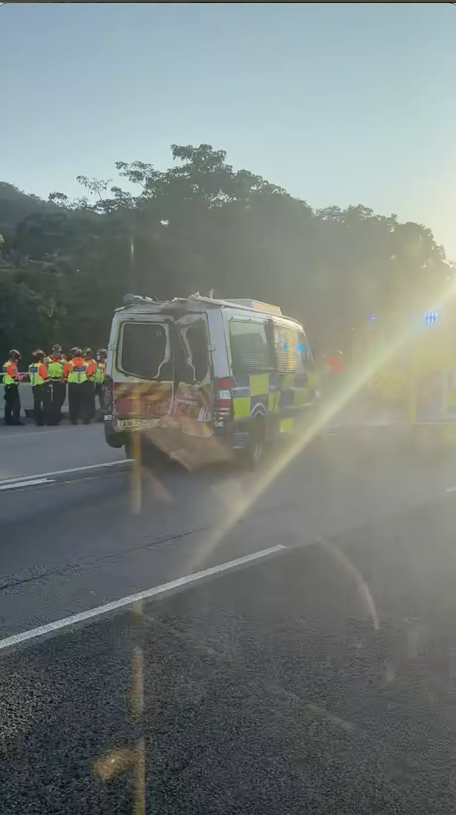 港深西部公路近廈村路發生交通意外,涉及城巴和警車碰撞,城巴車頭和警車車尾損毀。涉事城巴司機涉危駕致他人嚴重受傷被捕。