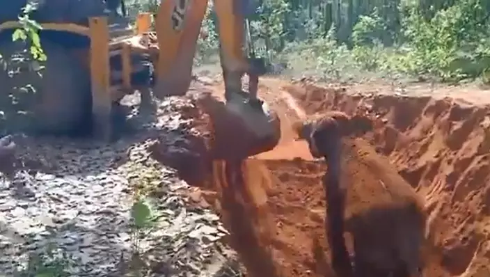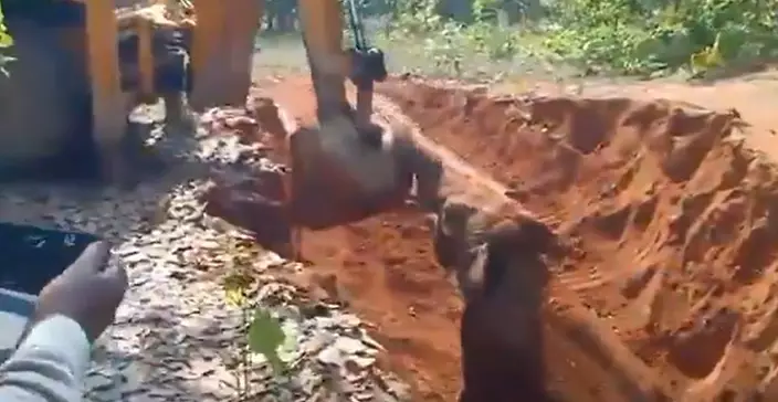 村民立即向林業官員報告了情況,隨即展開救援行動,勇敢地走近坑洞,用鏟子和推土機將坑洞邊緣剷平,為小象開闢了一條逃生通道。