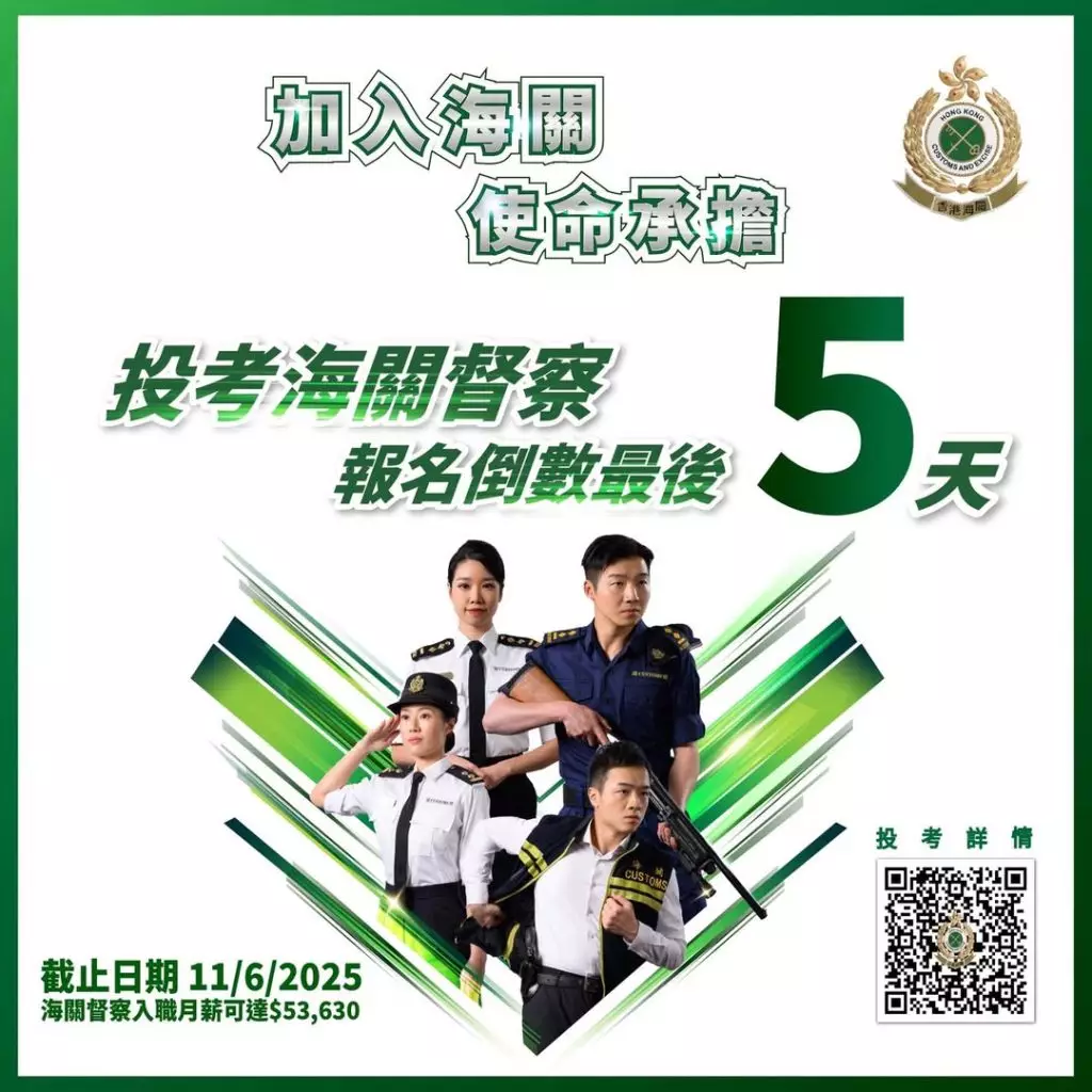 香港海關自上個月22日起招聘海關督察,即將於6月11日截止接受申請。海關在社交平台提醒有意投考的人士,考海關督察進入倒數最後5日。