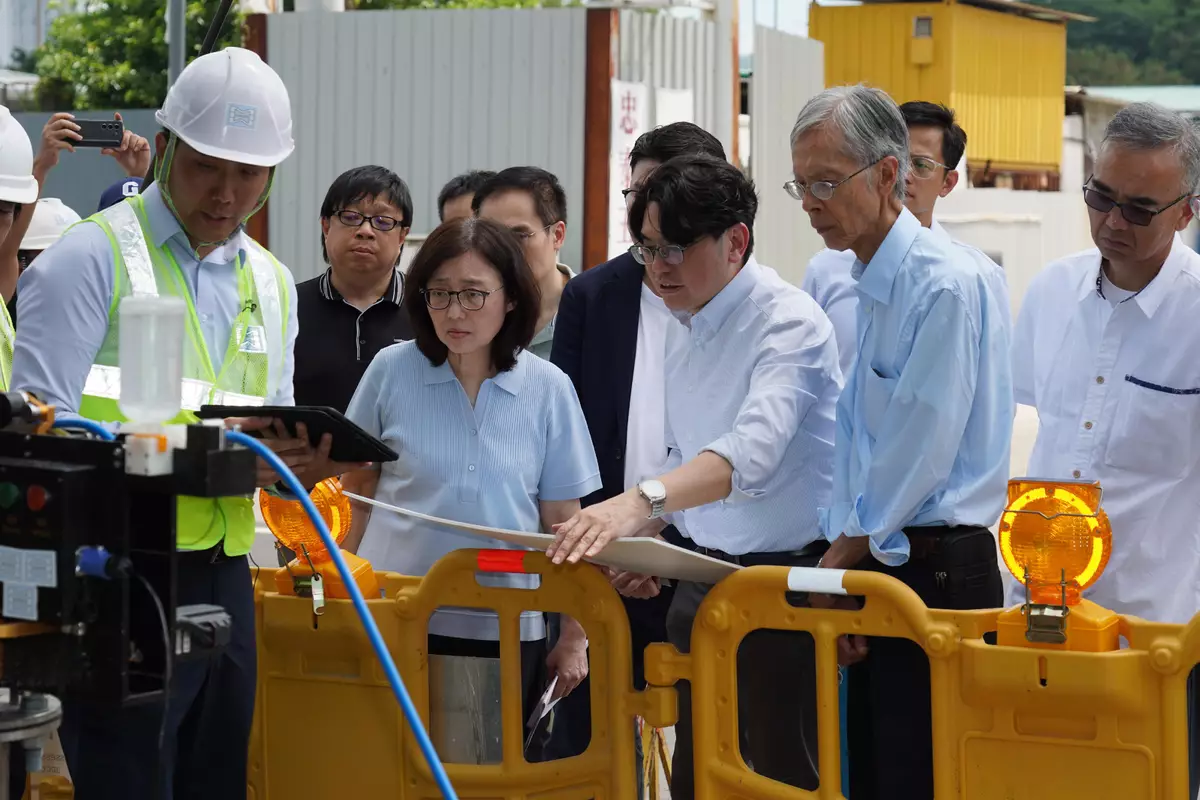 發展局局長甯漢豪(前排左二)在坪輋路聽取水務署署長黃恩諾(前排左三)介紹如何使用先進科技探測水管內的情況。 政府新聞處圖片